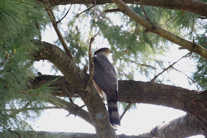 Hawk sitting in the pin oak tree in our yard. At first I thought it was a small red-tail hawk, but on